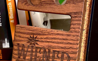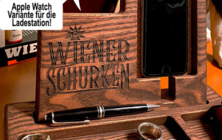 - Heißprägestempel mit unserem Logo: durch ein spezielles Verfahren wurde WIENER SCHURKEN in gold in das Holz gepresst, es funkelt und leuchtet im Licht – ein echtes Schmuckstück
